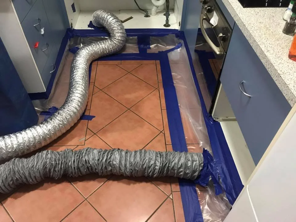 The Water Damage Network drying a kitchen with our structural drying equipment.